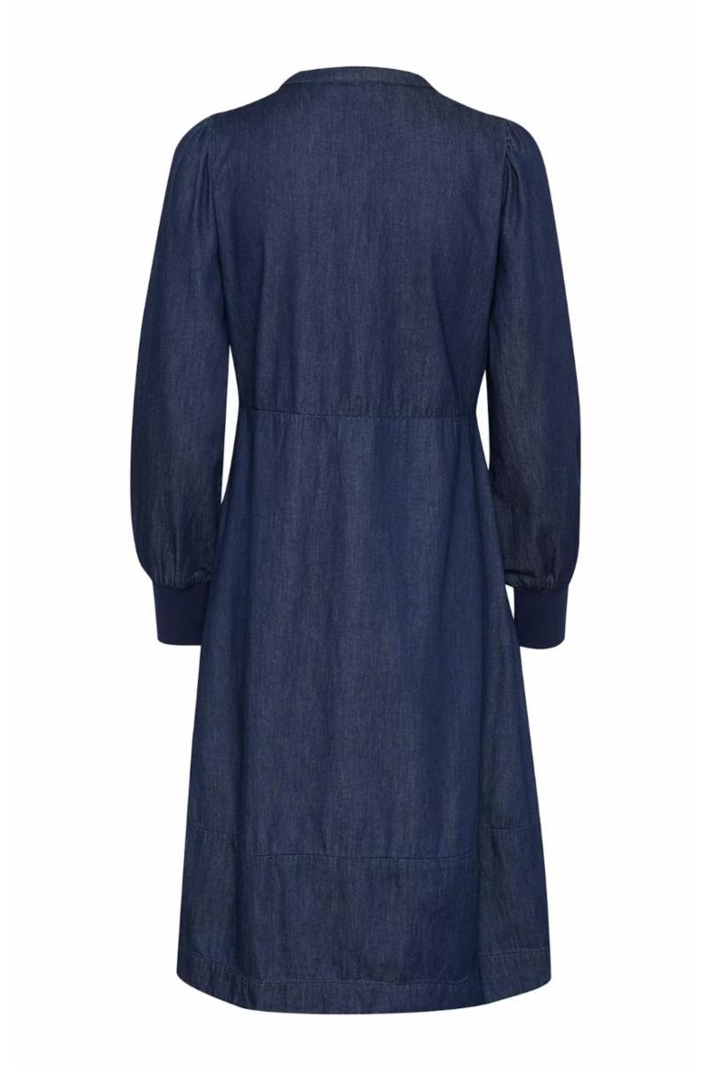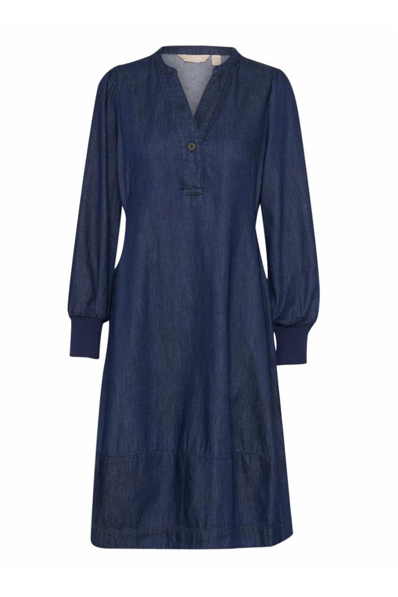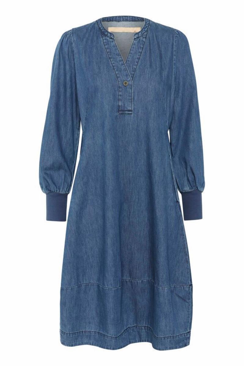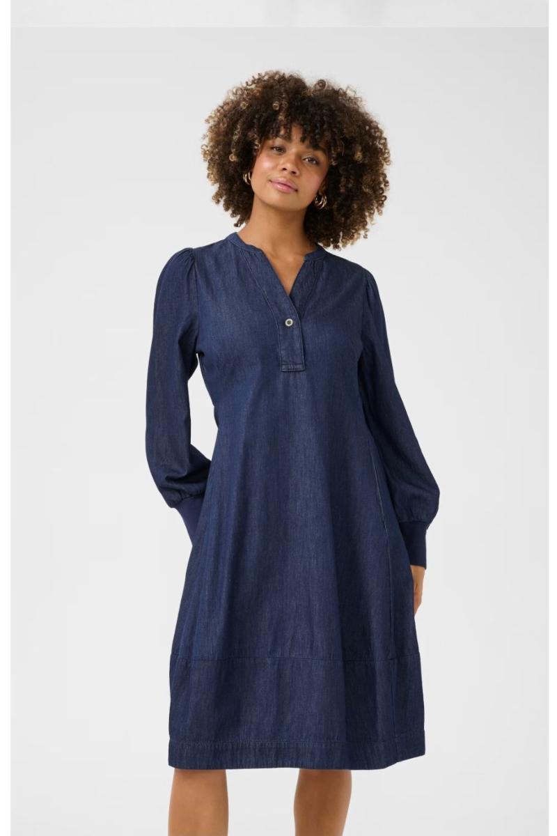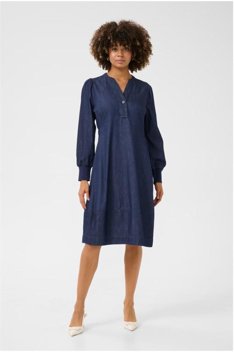 Denne denimbaserte kjolen har A-linje passform, rund V-ringning med knapp, lange ermer med brede mansjetter og sidelommer. Komfortabel og allsidig til hverdagsbruk.
