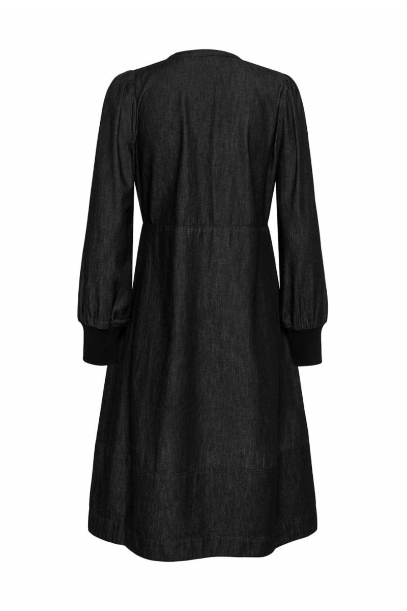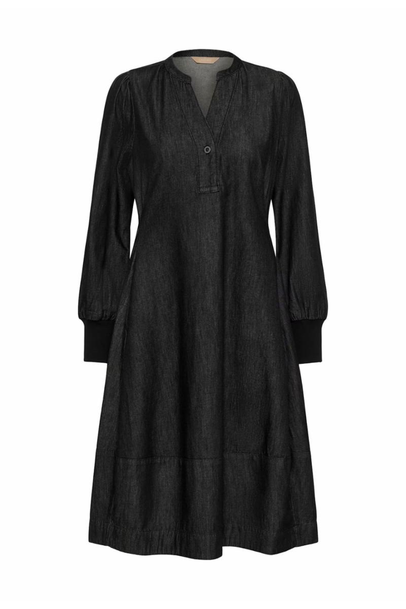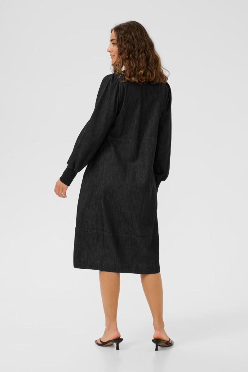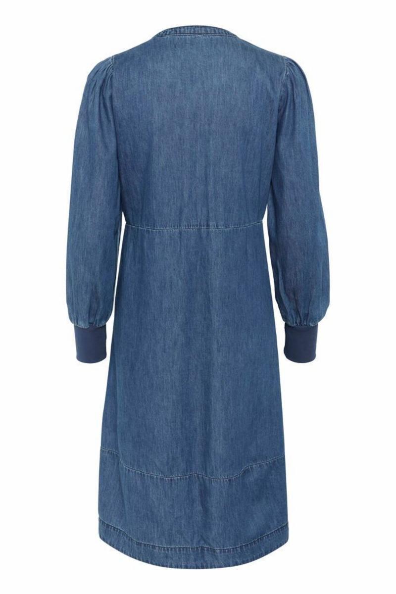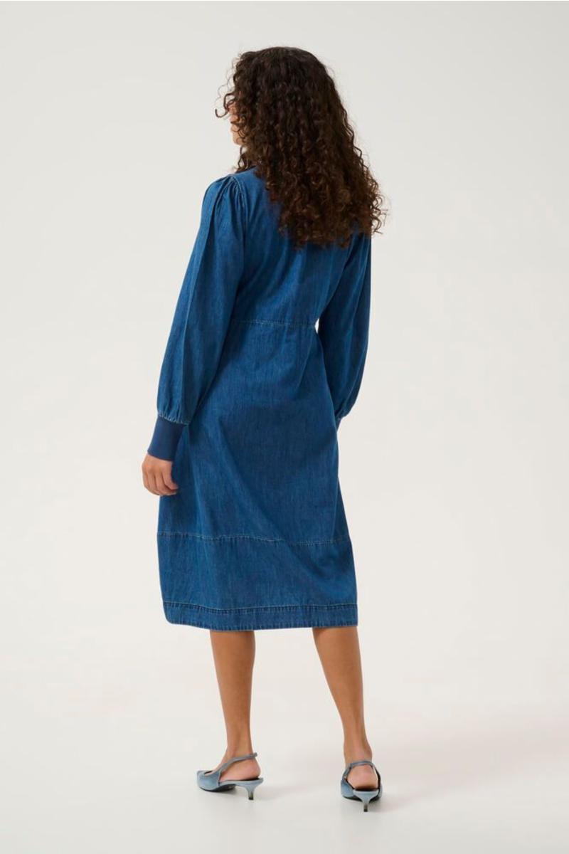 Denne denimbaserte kjolen har A-linje passform, rund V-ringning med knapp, lange ermer med brede mansjetter og sidelommer. Komfortabel og allsidig til hverdagsbruk.