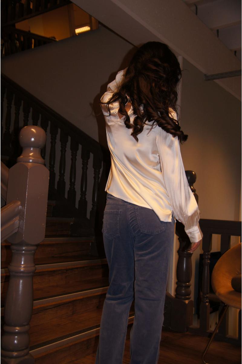 Nydelige Florence Blouse fra norske Ane Mone. En minimalistisk og elegant bluse i kremfarget sateng med lett glans. Florence har høy hals og brede mansjetter som gir et sofistikert uttrykk. Den rette passformen gjør den like fin til dressbukser som til et avslappet denimlook.