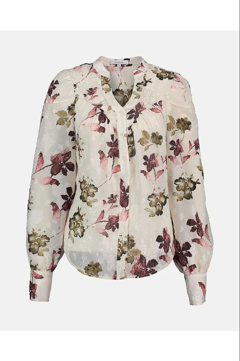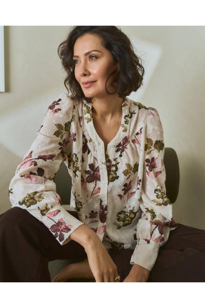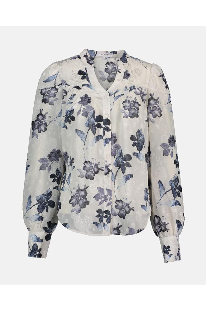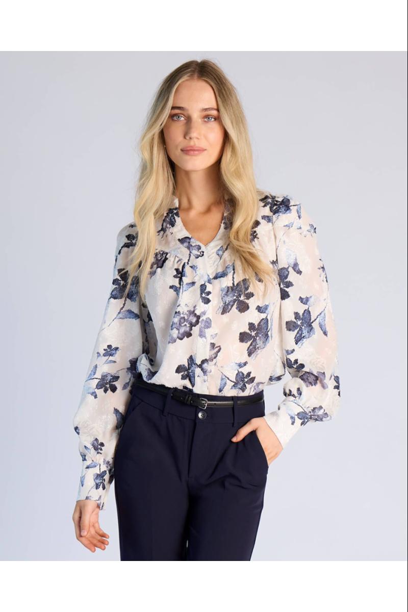 Olivia Flower blusen fra Floyd har en feminin knappestolpe foran, diskret puff på skuldrene og lette legg ved brystet som gir et sofistikert fall.