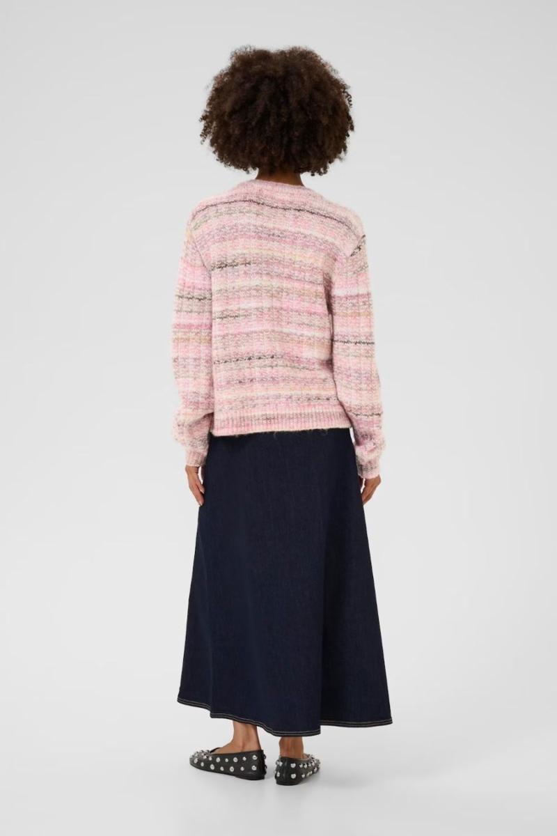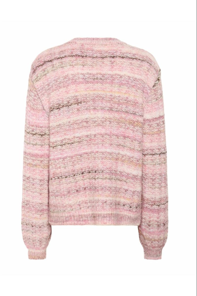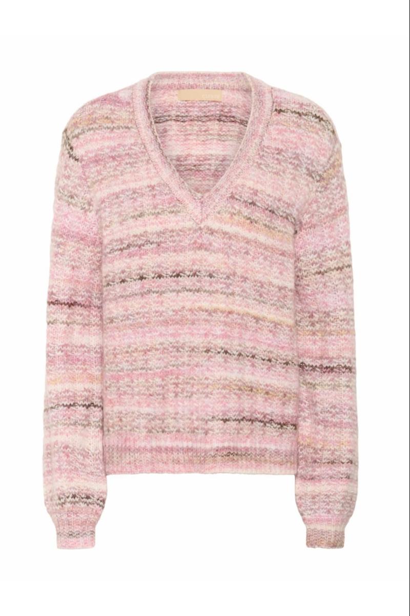 Denne damegenseren i strikket materiale har en løs passform, V-hals og lange ermer. Myk struktur gir komfort for daglig bruk.