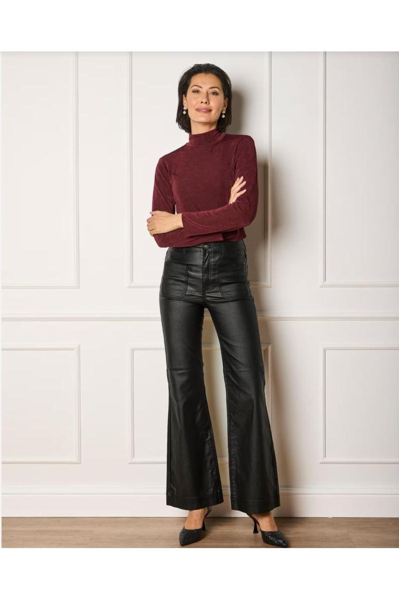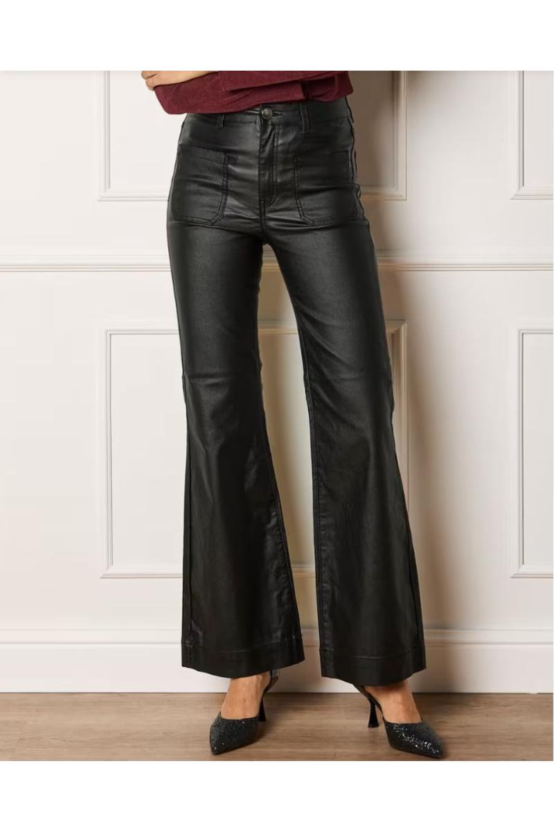 Denne stilrene buksen i imitert skinn kombinerer en moderne look med en komfortabel passform. Skinnbuksen har mellomhøyt liv som rekker rett nedenfor navlen, og vide ben som skaper et flatterende og lengre silhuettuttrykk. De markerte for- og baklommene gir buksen et trendy preg, samtidig som den beholder et klassisk uttrykk. Baklommene er plassert midt på rumpa. Den har sleng med dekorativ søm nederst på beina.