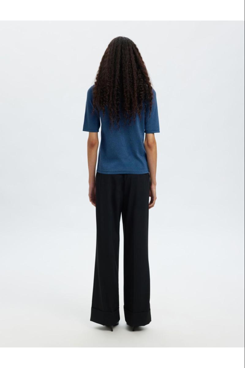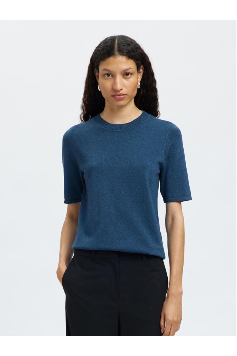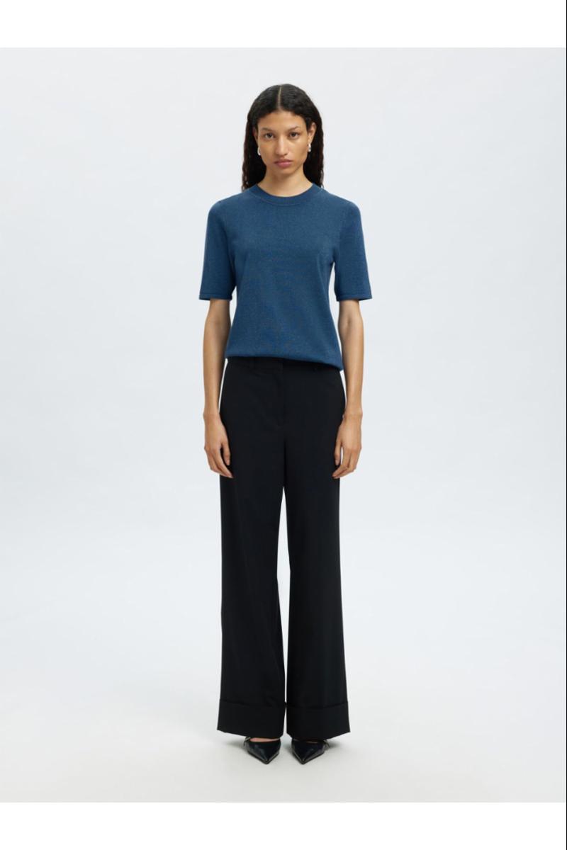 Hver kvinne trenger en pålitelig festtopp. Denne strikkede toppen med halvlange ermer er perfekt for arrangementer der du vil ta deg best mulig ut med minimal anstrengelse. Den har en enkel og elegant silhuett med subtile glittertråder som løper gjennom den. Bruk den med figursydde bukser med vide ben og høye hæler med spiss tå.