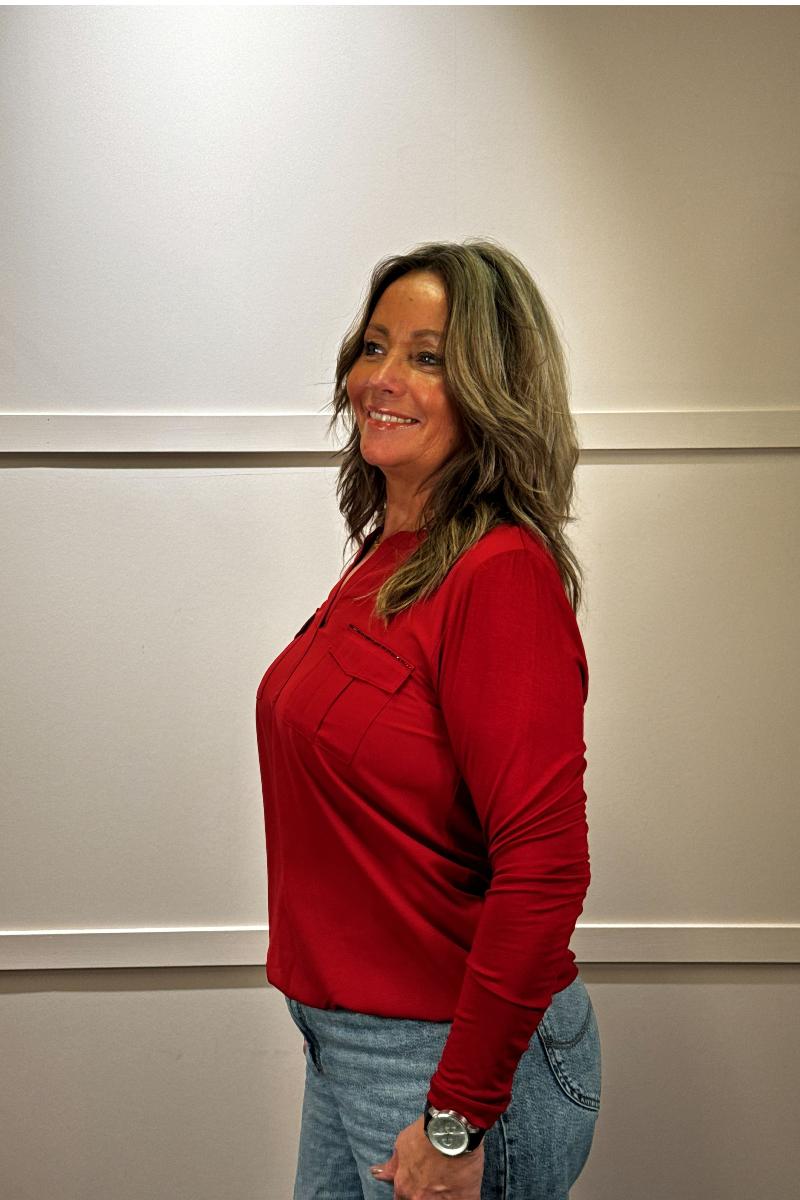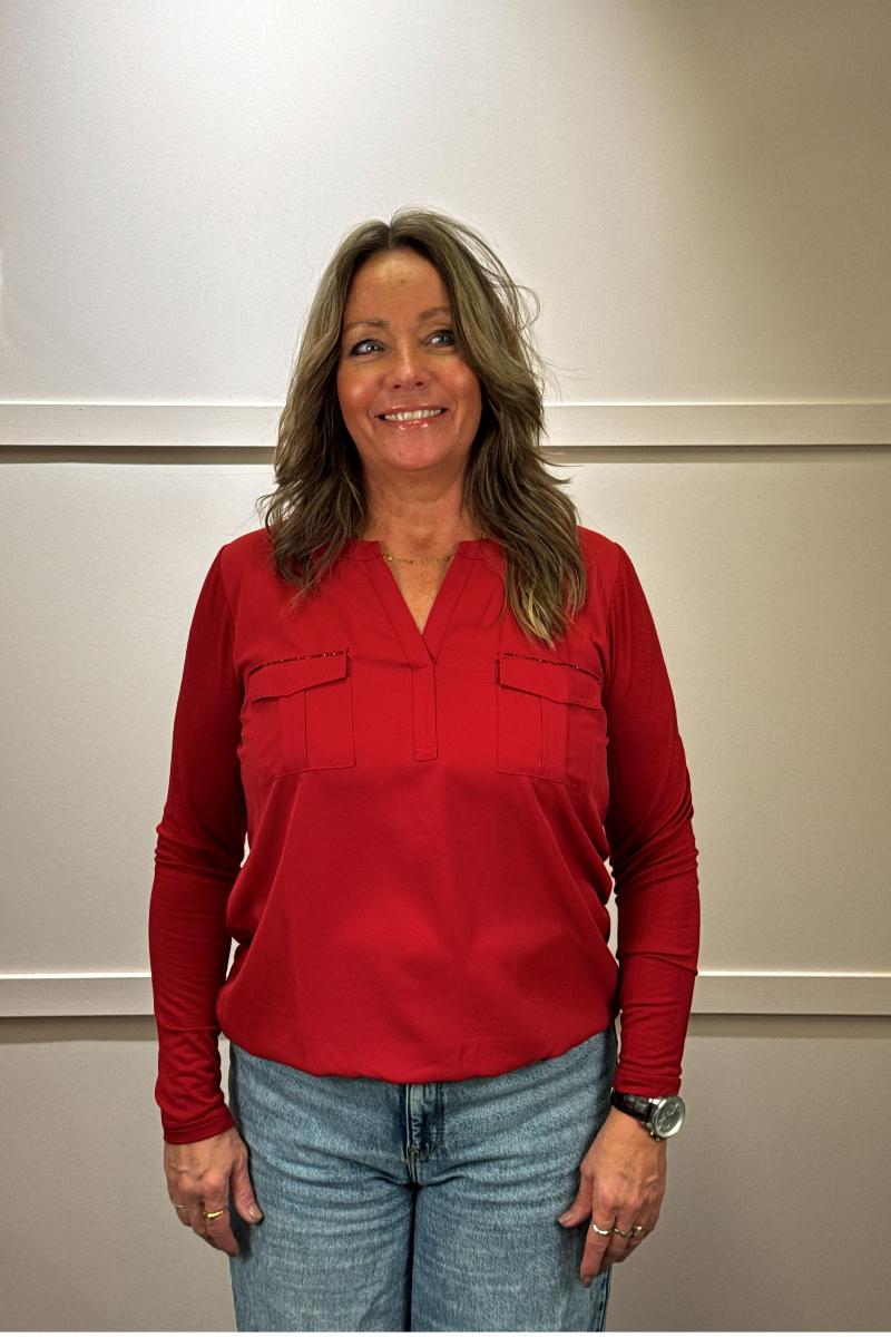 SC-Hermine 1 er en bluse i LENZING™ ECOVERO™ viskose og elastan kvalitet. Blusen har knappestolpe, V-hals og to lommer på brystet. Style dette plagget med et par smale jeans til hverdagsbruk.
