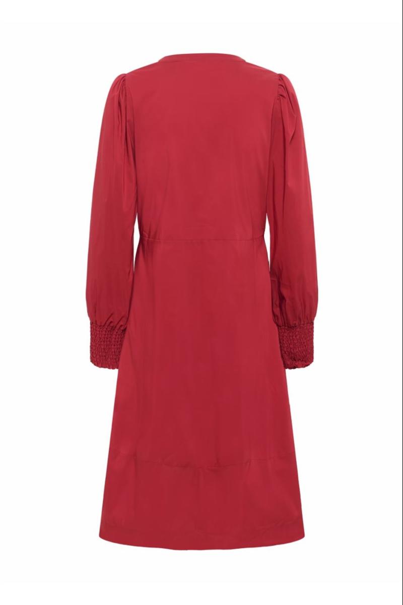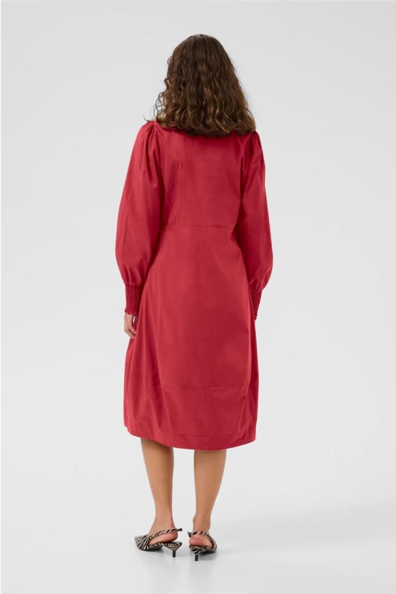 Denne midikjolen har en avslappet passform, V-utringning med knappdetaljer og lange ermer med smock. A-linjeform gir komfort og allsidighet.