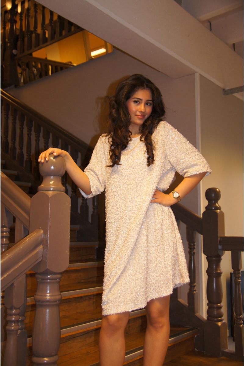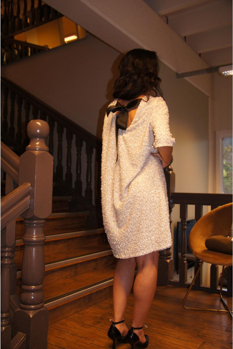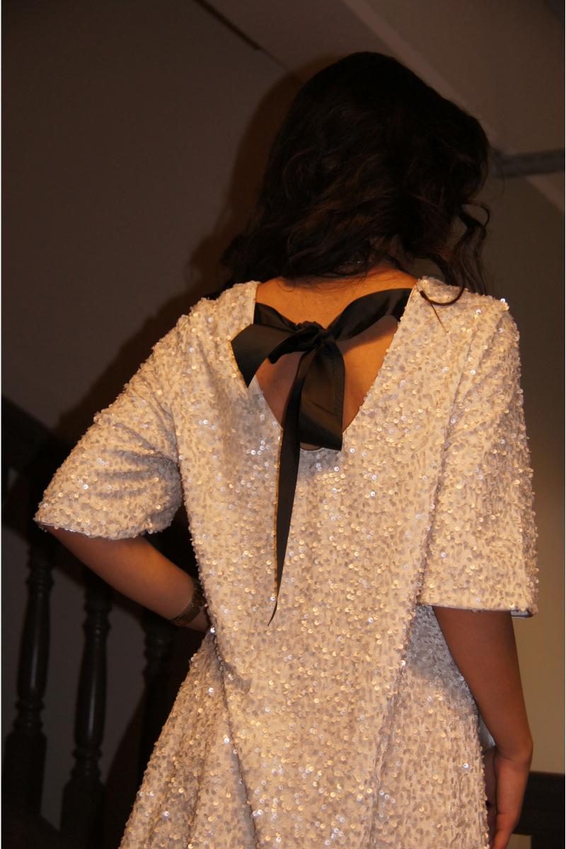 Denne glitrende hvite kjolen fanger lyset på en elegant måte og gir et eksklusivt uttrykk til sesongens festligheter. Den vakre svarte sløyfen som knyttes bak i nakken, skaper en feminin kontrast og tilfører kjolen det lille ekstra.