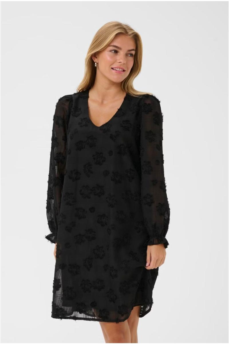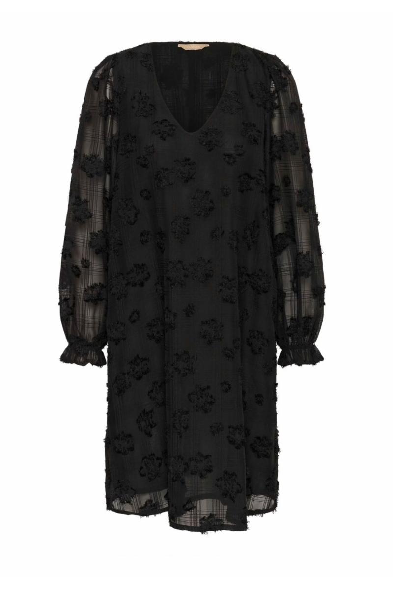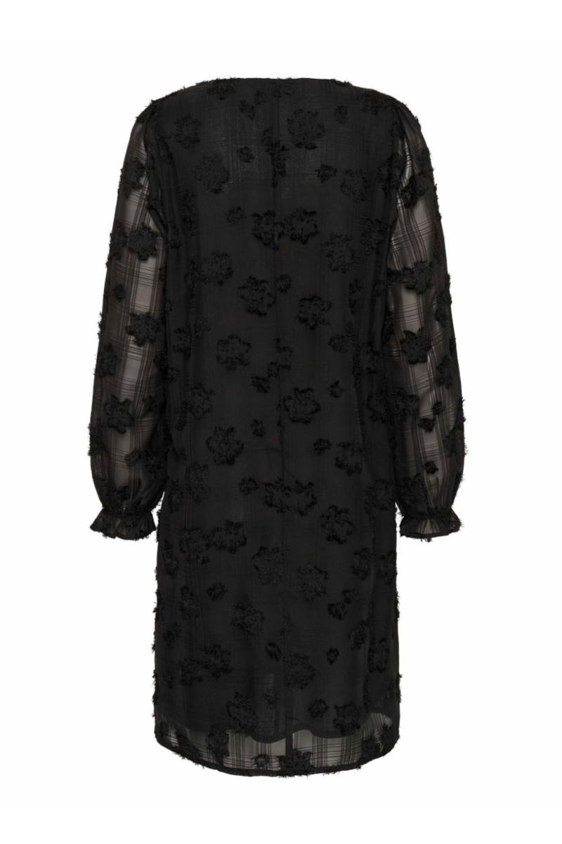 Damekjole med avslappet passform, V-hals og lange, halvtransparente ermer. Strukturerte blomsterelementer gir komfort og stil til enhver anledning.