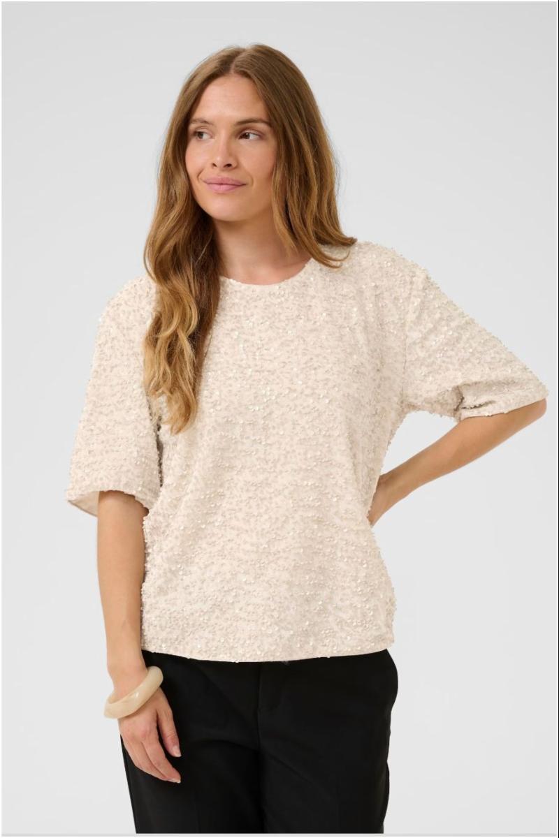 Denne dameblusen har en avslappet passform, rund hals og korte ermer. Dekorative paljetter gir et elegant preg, perfekt til hverdag og fest.
