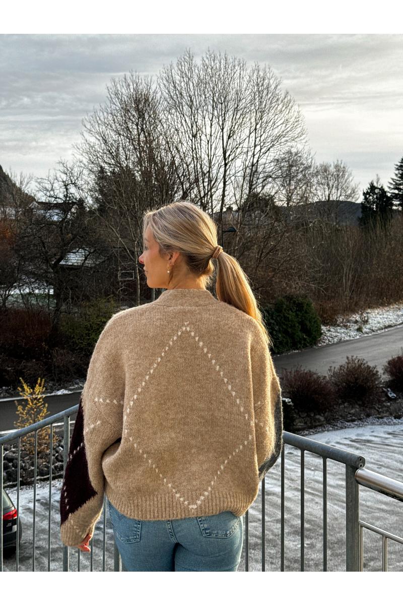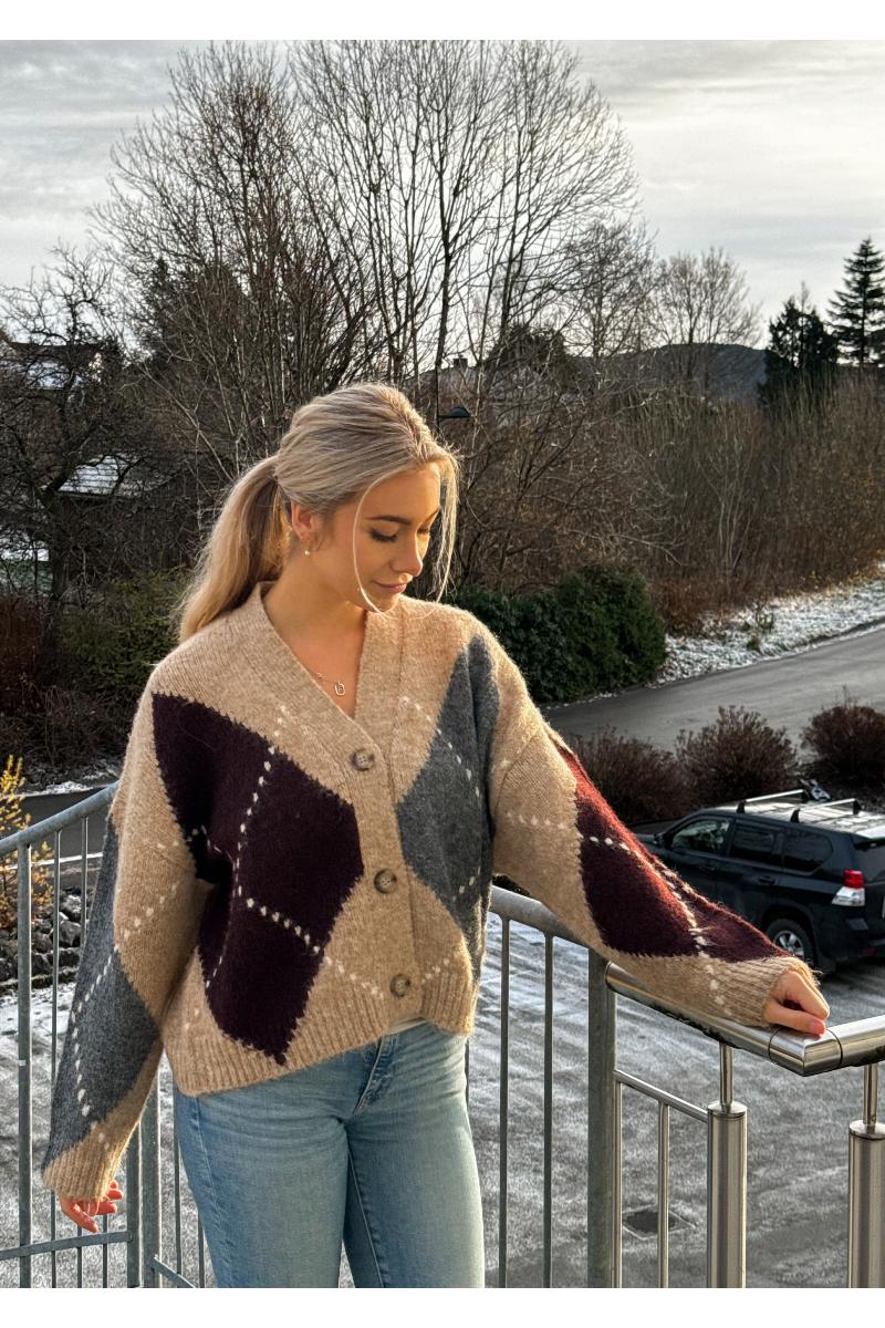 N-Laiana Knit Cardigan er en oversized cardigan med klassisk argyle-mønster. Den har en løs passform, lange voluminøse ermer og en kortere lengde. Argyle-designet gir et tidløst og eksklusivt uttrykk, perfekt for høstens mange trender. Et must-have i garderoben.