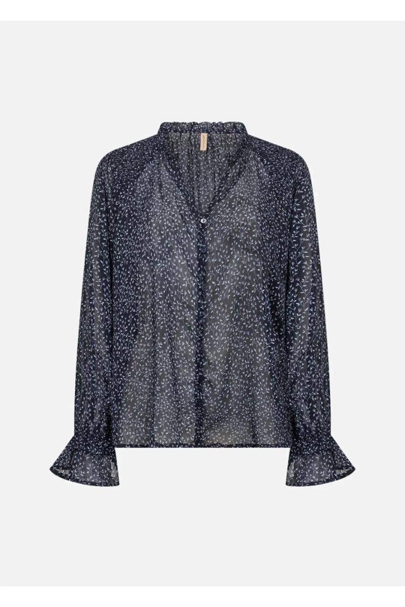 SC-BEBBIE 2-skjorten er laget av 100 % resirkulert polyester. Denne elegante skjorten har en delikat krage med frynser, knapper ned foran, lange ermer med vide mansjetter og et intrikat bladmønster. Kombiner den med skreddersydde bukser for et stilfullt uttrykk.