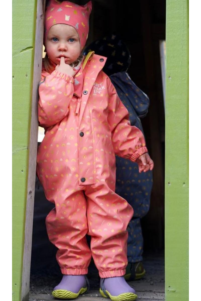 Babyregndress Dugg – kolleksjon «Superkatten 2026»Babyregndress Dugg er laga for dei minste barna i ekstra mjukt PU-materiale som gir god komfort og rørslefridom. Dressen er lett vattert (40 g) og held barnet varmt og tørt på våte og kjølige dagar.
