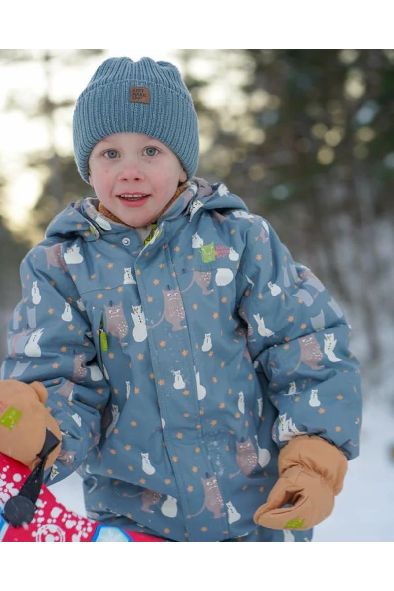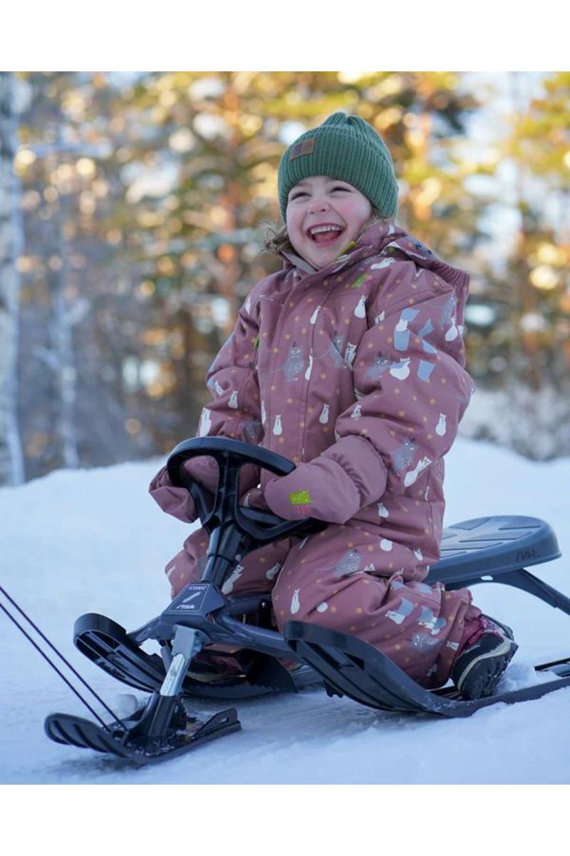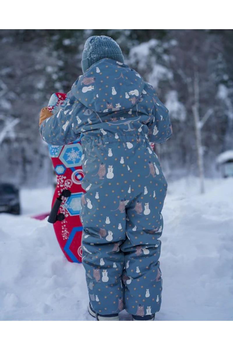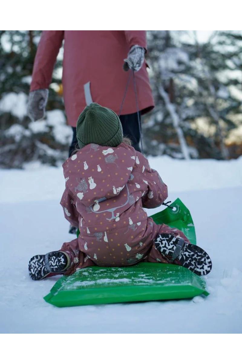 Parkdress Snø - kolleksjon «Tolvmeterskogen 2025». Laget for kalde dager i 100 % nylon som er slitesterk (80 000 sykluser Martindale) og pustande (minst 5000 g/m2/24h). Dressen har en vannsøyle på 12 000 og holder barna tørre selv i våt snø. Foret er av vatt og tørker fort om en snur den etter vask. Dressen er utstyrt med slitesterke fotstrikker, navnelapp, reflekser på ermer, bein og rygg og snøstopp på ermer. Dressen har sikkerhetshette som om er både avtagbar og regulerbar.