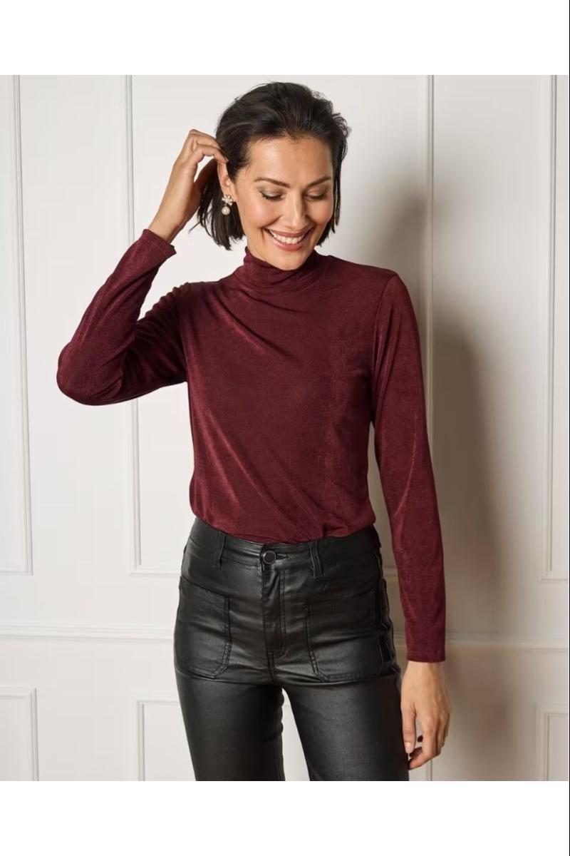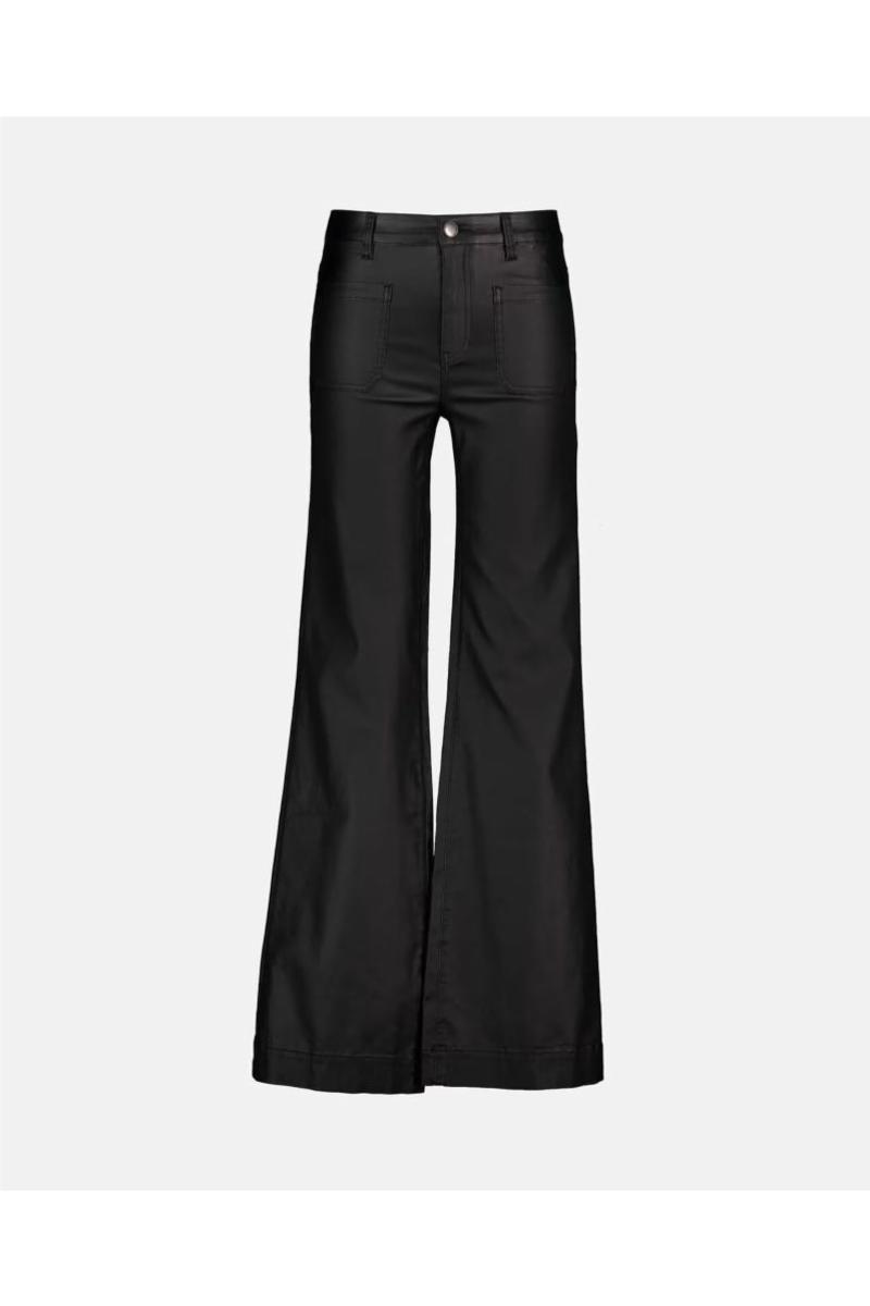 Denne stilrene buksen i imitert skinn kombinerer en moderne look med en komfortabel passform. Skinnbuksen har mellomhøyt liv som rekker rett nedenfor navlen, og vide ben som skaper et flatterende og lengre silhuettuttrykk. De markerte for- og baklommene gir buksen et trendy preg, samtidig som den beholder et klassisk uttrykk. Baklommene er plassert midt på rumpa. Den har sleng med dekorativ søm nederst på beina.