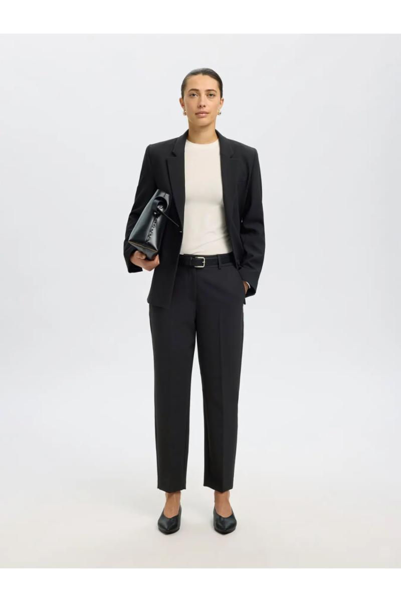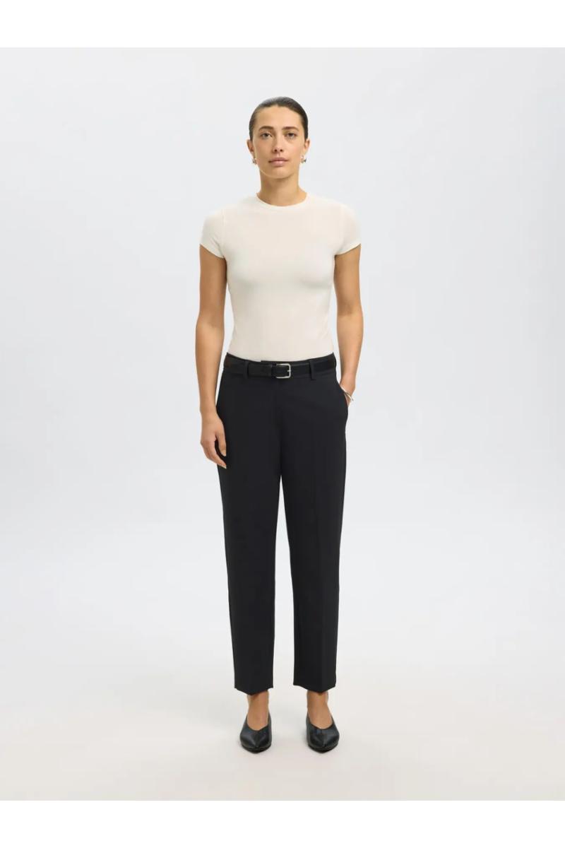 Basisplagg trenger ikke å være kjedelige, spesielt ikke når de er fagkyndig figursydd. Disse buklsene kommer i en flatterende smal passform som gjør dem til et ideelt grunnlag for ethvert antrekk. Den komfortable middels høye midjen har beltehemper og stikklommer i sidene. Pressfoldene midt på foran tilfører en skarp detalj. Vi mener disse vil se bra ut med nesten hva som helst, men hvorfor ikke style dem med en oversized t-skjorte og kraftige joggesko.