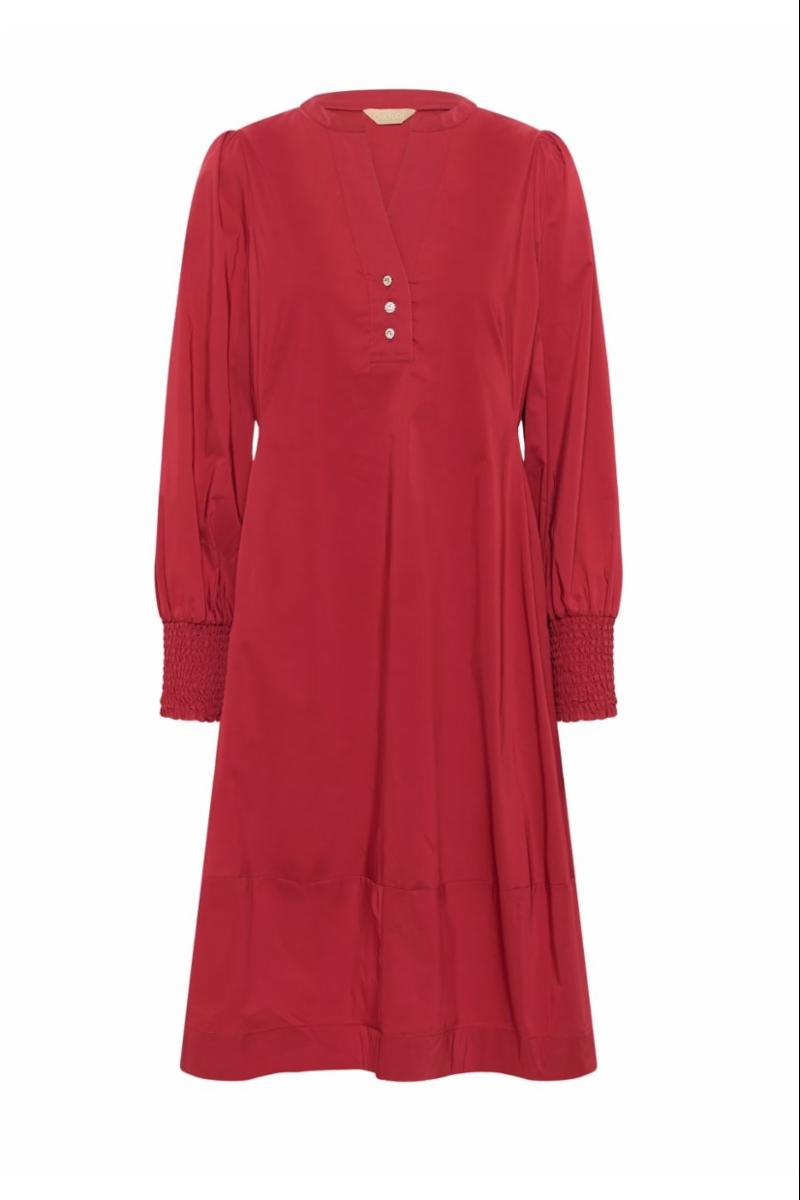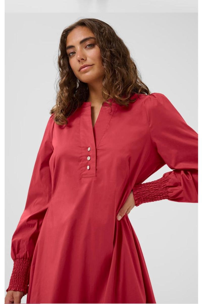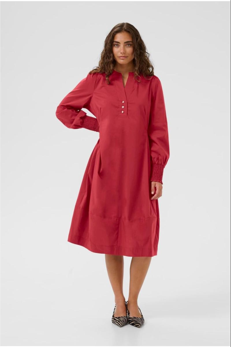 Denne midikjolen har en avslappet passform, V-utringning med knappdetaljer og lange ermer med smock. A-linjeform gir komfort og allsidighet.