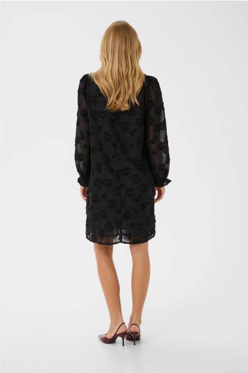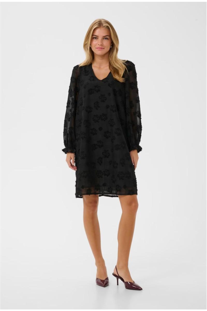 Damekjole med avslappet passform, V-hals og lange, halvtransparente ermer. Strukturerte blomsterelementer gir komfort og stil til enhver anledning.