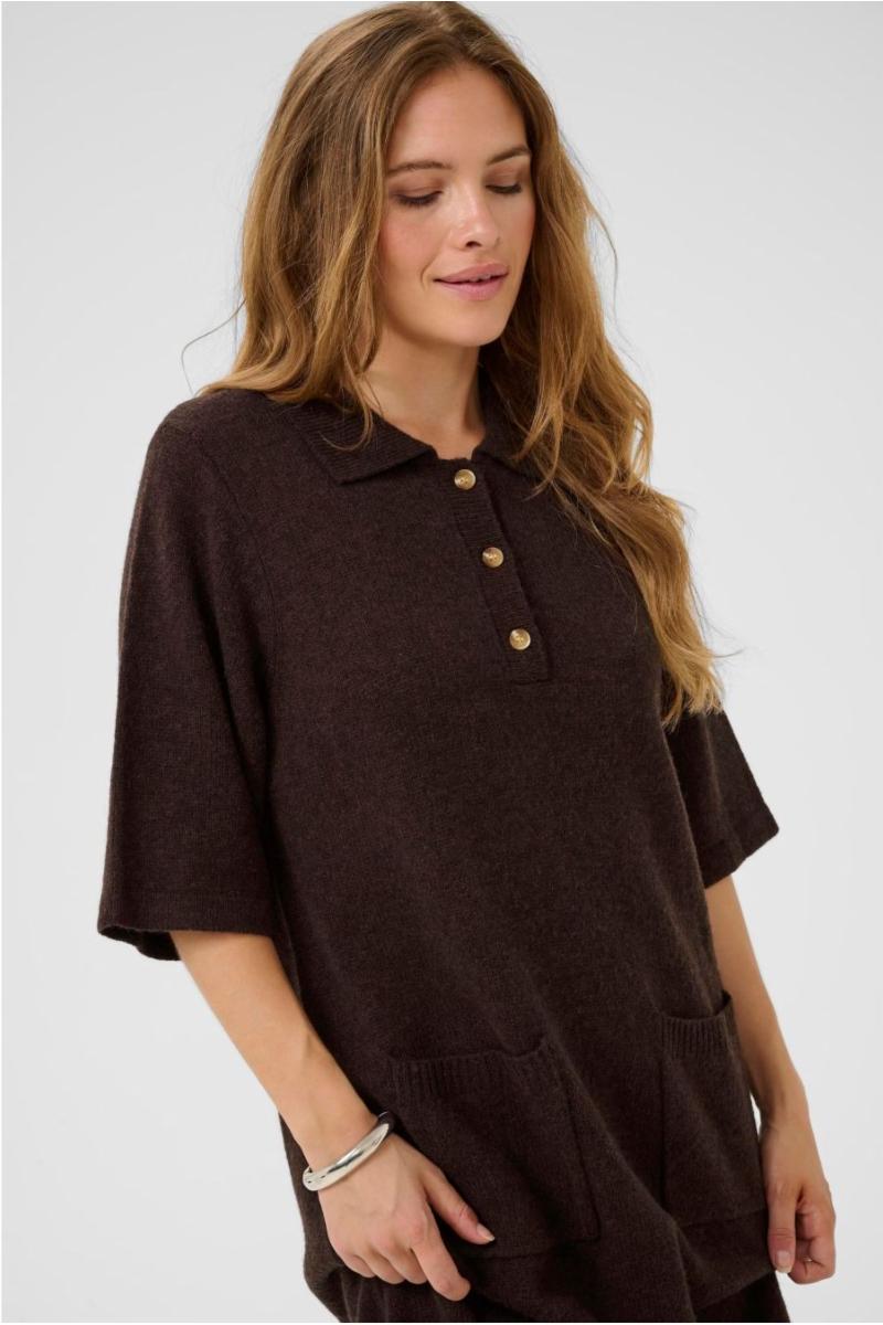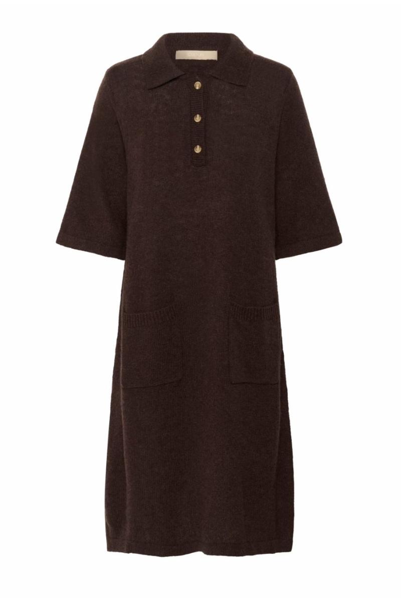 Strikket kjole med avslappet passform, polokrage og korte ermer. Praktisk knappestolpe og to lommer. Komfortabel for ulike anledninger.
