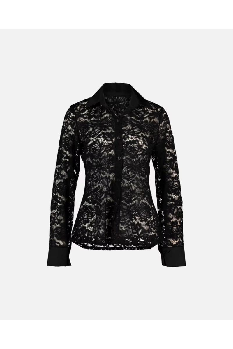 Elegant blondeskjorte med satengdetaljer. Skjorten har klassisk krage, knappestolpe og mansjetter i sateng som gir en fin kontrast til den transparente blondekvaliteten. Mansjettene har én knapp, og blondestoffet har et vakkert blomsterinspirert mønster som gir et feminint uttrykk.