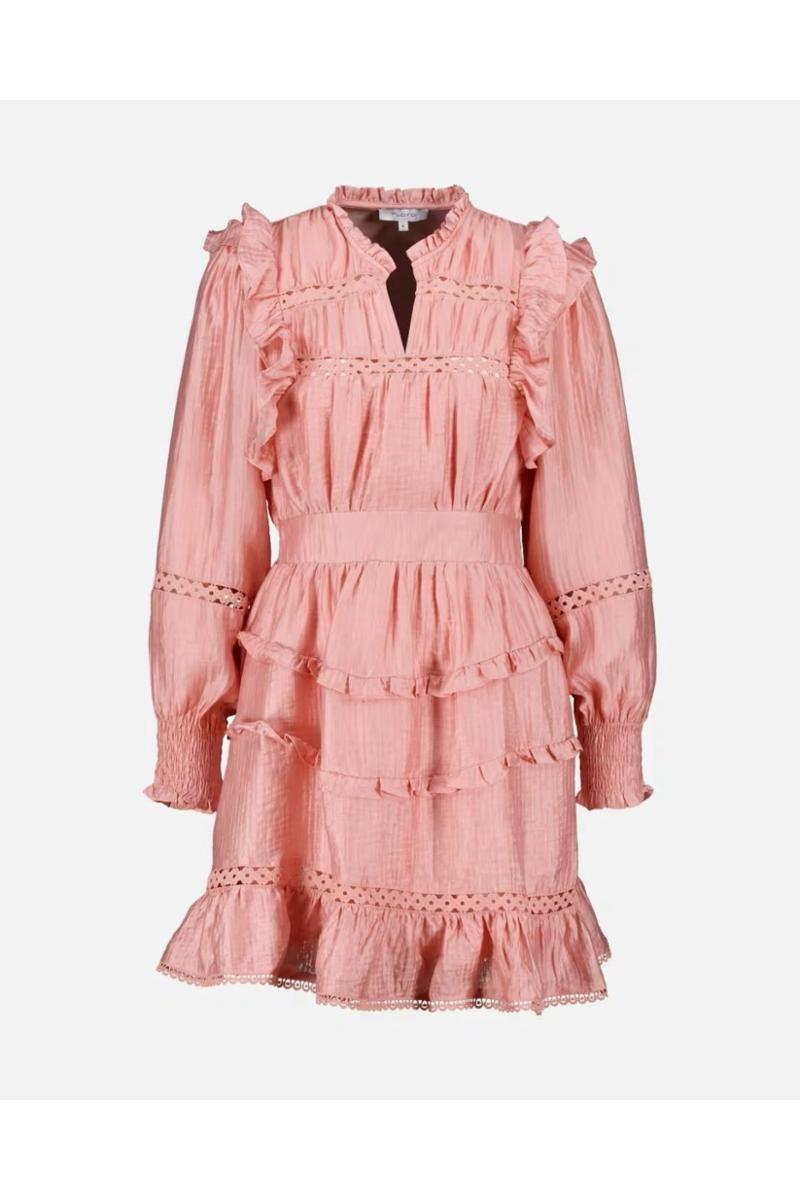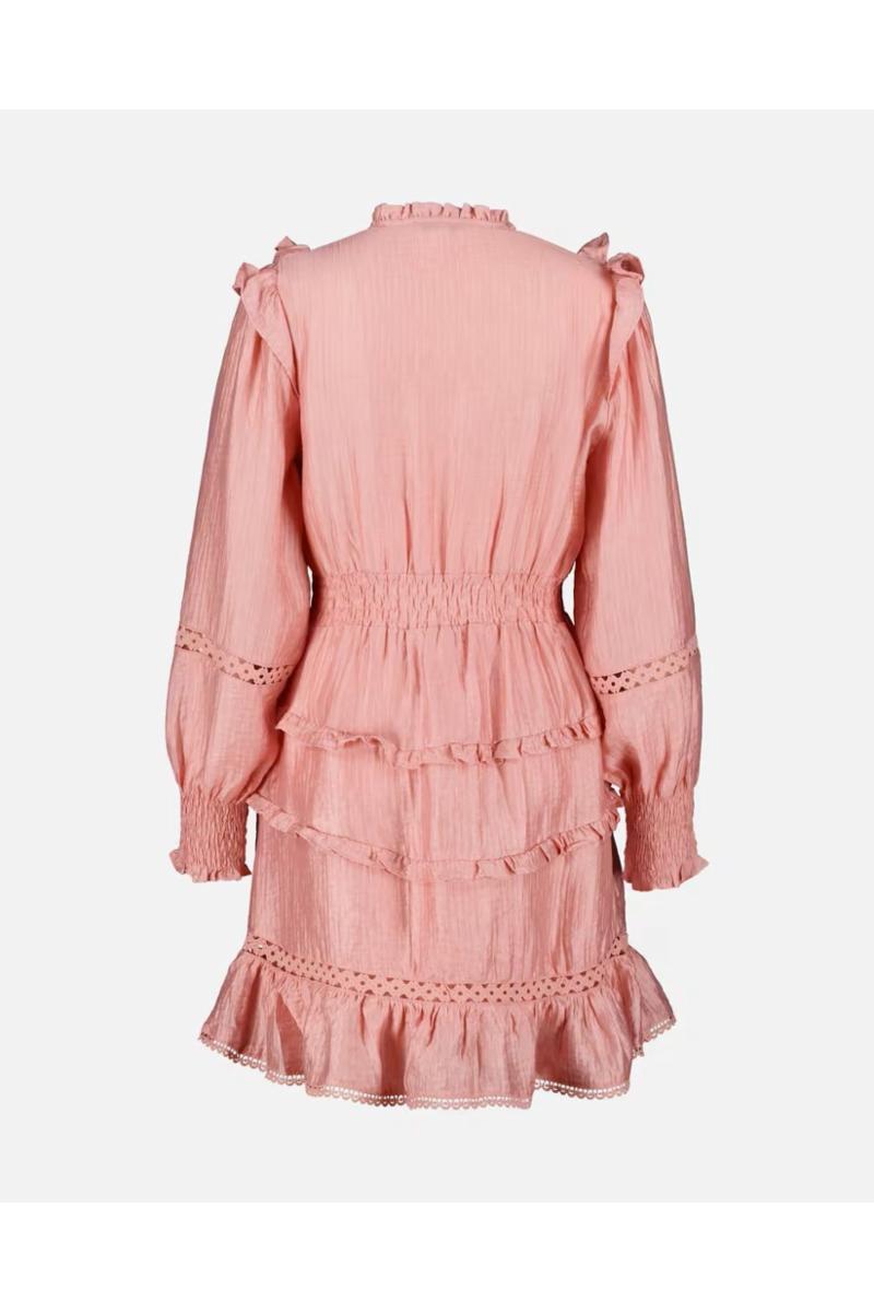 Denne kjolen har et romantisk uttrykk med innsvinget passform som fremhever midjen på en naturlig måte. V-halsen med rysjekant og volanger på skuldrene gir en feminin ramme, mens gjennomsiktige blondedetaljer over bryst og ermer skaper et lett spill.