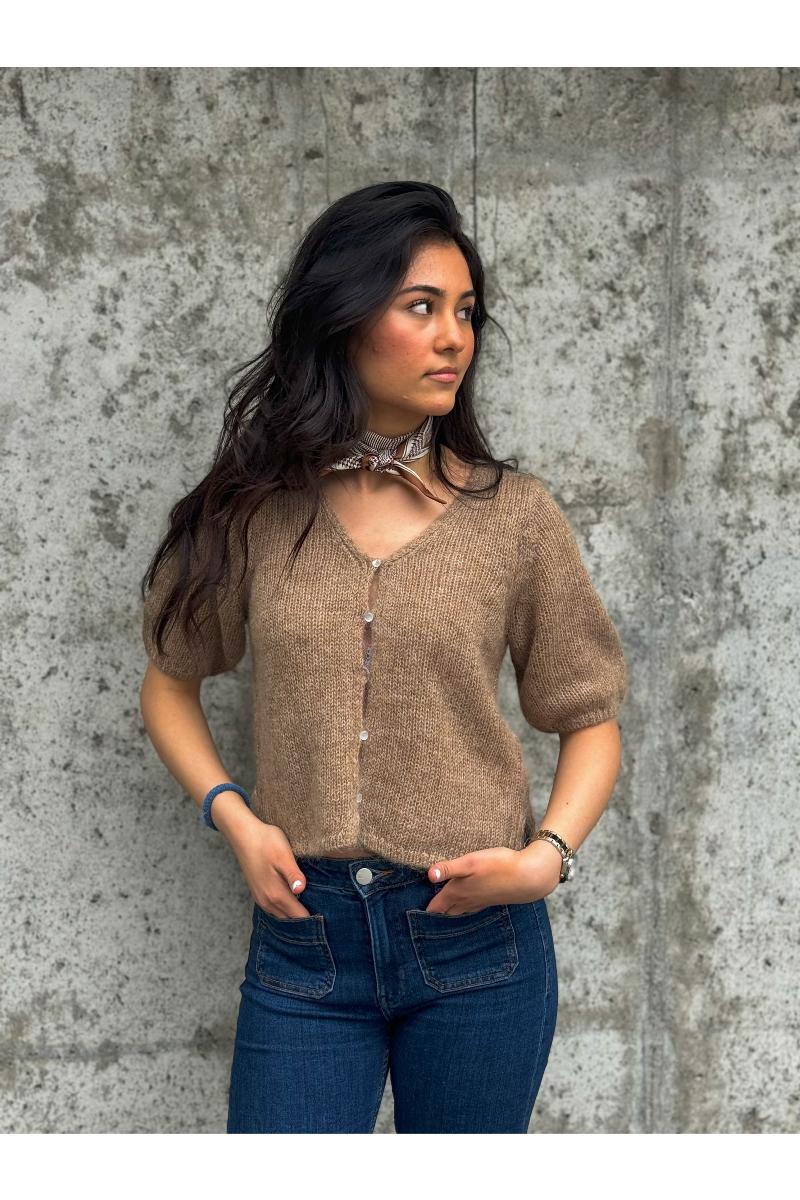 Strikket cardigan med myk tekstur, V-hals, avslappet rett passform, korte puffede ermer og knapping foran. Enkel og stilsikker lag-på-lag stil.