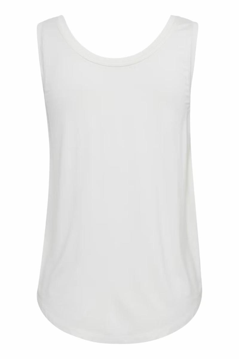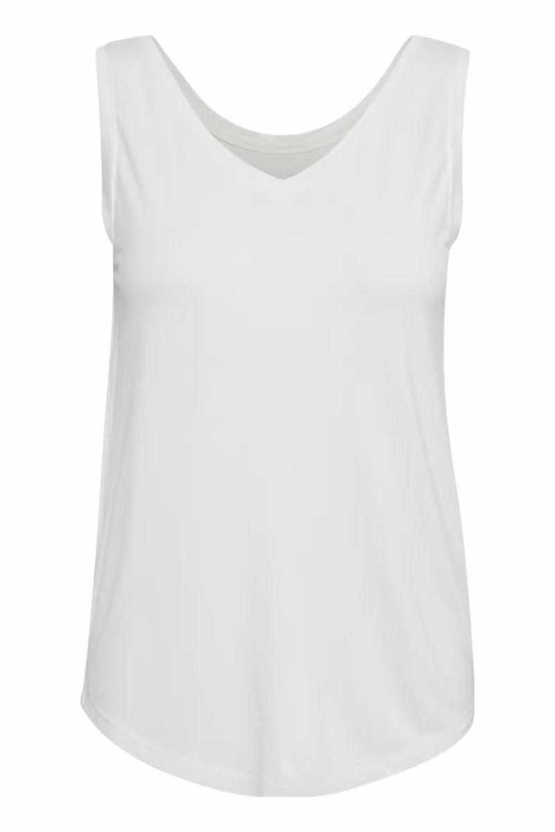 Ermeløs topp for dame med V-hals og buet kant, normal passform og mykt stoff. Praktisk for lag-på-lag og gir behagelig komfort. Passer til hverdags og jobb.
